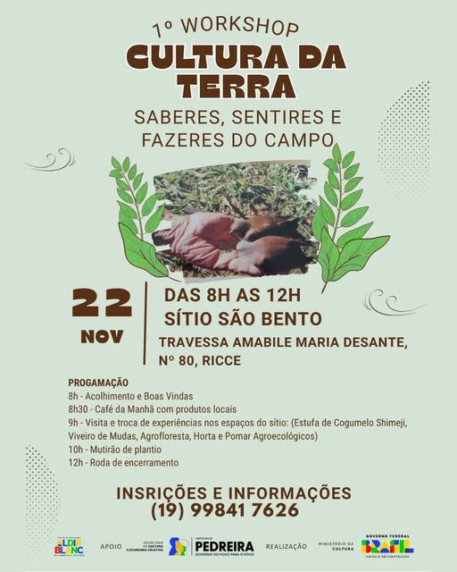 Saberes, Sentires e Fazeres do Campo, no sábado, 22 de novembro, das 8h às 12h, nas dependências do Sítio São Bento, localizado na Travessa Amábile Maria Desante, nº 80, Ricce, contando com o apoio da Prefeitura Municipal através de sua Secretaria de Cultura e Economia Criativa e realização do Ministério da Cultura do Governo Federal pela Política Nacional Aldir Blanc de Fomento a Cultura.