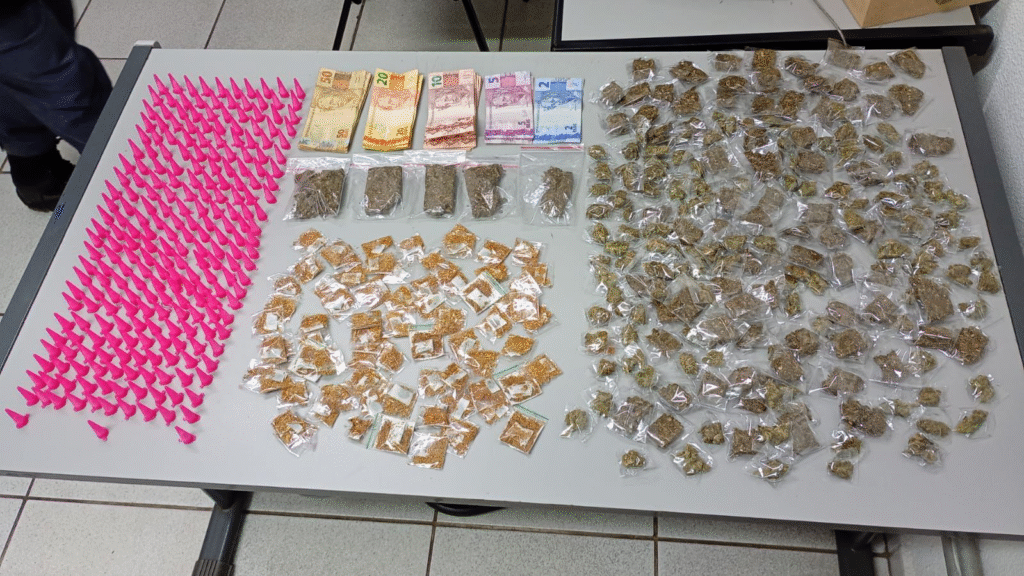 Os policiais iniciaram o acompanhamento e conseguiram detê-lo após resistência, que precisou ser contida para garantir a segurança da intervenção. Ao verificar o conteúdo da mochila, foram encontrados 243 microtubos de cocaína, 215 porções de maconha, 5 mini tijolos da mesma droga, 75 unidades de “dry” e R$ 704,00 em dinheiro, indicando atividade relacionada ao tráfico de drogas.