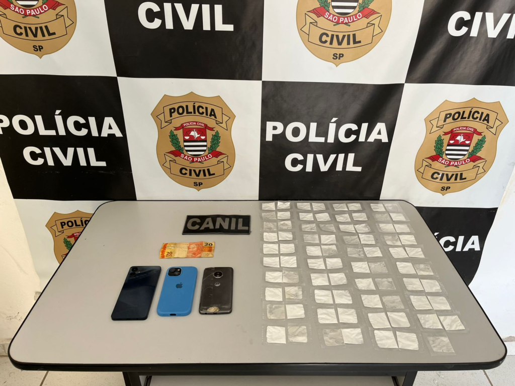 Diante do flagrante, uma abordagem foi realizada, resultando na prisão do suspeito. Em buscas no interior da residência, foram localizadas 79 porções de cocaína, dois aparelhos celulares e uma quantia em dinheiro. O material foi apreendido para instrução do inquérito.