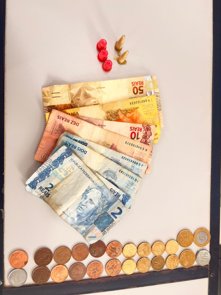 Durante a revista, a guarnição localizou com o comprador um invólucro de crack. Com o vendedor, foram encontrados R$ 101,45 em espécie e mais quatro porções de drogas (duas de cocaína e duas de crack), embaladas de forma idêntica à porção vendida. O comprador confessou ter pagado R$ 20,00 por uma pedra de crack e ainda não havia recebido o troco de R$ 10,00 no momento da interrupção policial. O suspeito de tráfico apresentava comportamento agitado e sinais de embriaguez ou uso de entorpecentes, sendo controlado.