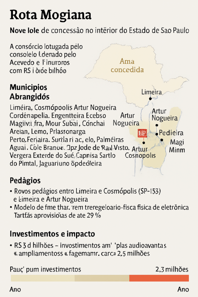 A concessão abrange 22 municípios e beneficiará cerca de 2,3 milhões de pessoas, com investimentos previstos de R$ 9,4 bilhões destinados à duplicação de pistas, construção de faixas adicionais, marginais e melhorias na segurança viária.